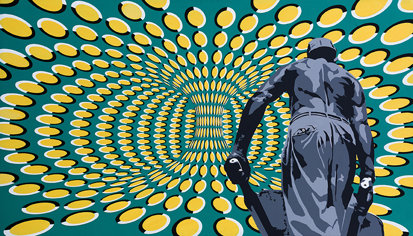 The artistic poetry of Jorge Rodríguez Diez, from the view of design, is problematized with the social dilemmas that surround the present, but only by freeing oneself from professional practice, deprived of the weight of the commission, of the practical (utilitarian) and the precise message, will your products become more and more like painting. “Retro” enters the scene in his work, motivating satire and humor, immediately put in line by the viewer. The “Vintage,” in the form of commercial advertising, activates the ambiguity through simulated commercials where certain expectations of the informed observer end up translating into a rough mixture or suggesting in their minds contradictions, inducing the most diverse relations with local and international reality. The works of R-10 are those that seek to impose themselves only once, although they incorporate headpieces, guidance in the form of small letters and a climate of uncertainty, because generally they result in a field sown with their patterns, slogans and instructions. A precise and subtle individual mythology, operating with salvaged characteristics and tropes. A key contribution of Jorge is, without a doubt, is precisely that of delivering an image packaged as a game to assemble, but without a manual. Now, none of this can be adequately analyzed without coming into direct contact with his works because on the surface, there are sensory effects, finishes and textures that also connect with the original mediums from which commercial ads and political advertisements were born. Such semantic operations are created by R-10, as if he wanted to place a mask on each symbol and thus force his interpretation as much as possible, even to the environments he conceives, he gives an emblematic character to which he attributes a situational role, which guides the viewer in the direction of a certain legendary scene.
