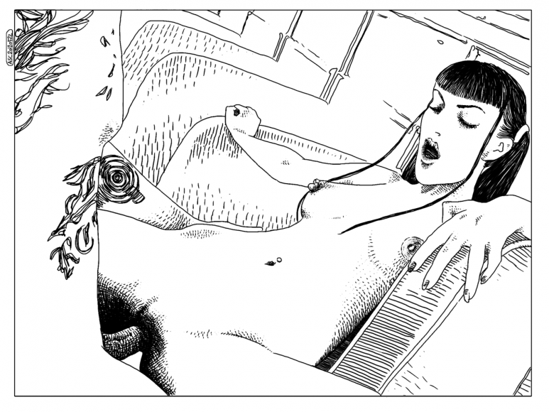 Sus dibujos son producto de su deseo, Apollonia manifiesta: “La tinta es mi sangre y dibujo para satisfacer mi propio placer”. Tiene como referentes la mitología griega, mitos como los de Ariadna y el Minotauro y el rapto de Proserpina, pasa por los relatos del Marqués de Sade y Apollinare, hasta las imágenes pornográficas que circulan por internet. Apollonia tiene un estilo propio para contar sus historias, sus dibujos digitales parecen grabados. Las mujeres que retrata desbordan sensualidad. Sus escenas parecen salidas de un intenso sueño erótico donde cualquier fantasía es posible.