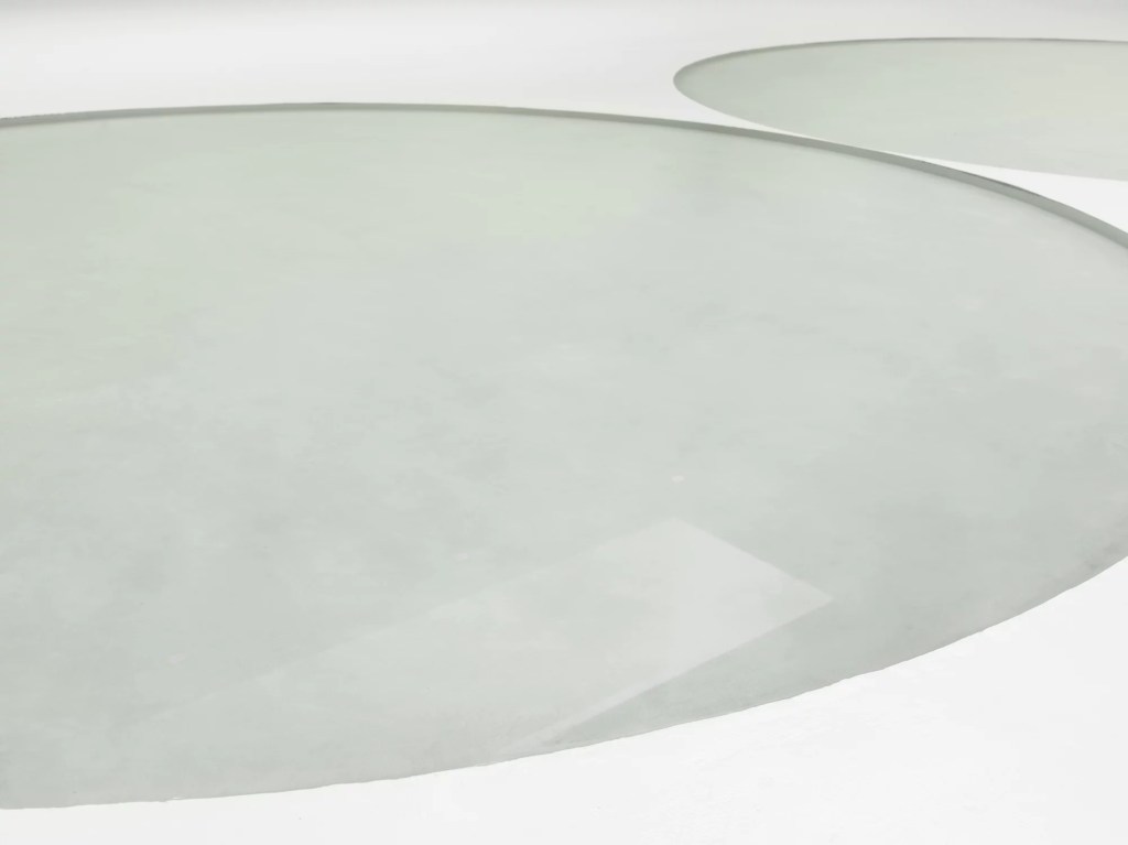 “Untitled” (Sagitario) consists of two twelve-foot diameter circular reflecting pools, embedded and level with the floor of the gallery space. The pools are positioned to be just touching, causing a nearly imperceptible exchange of water. The motif of the double—and paired circular forms in particular—recur throughout Gonzalez-Torres’s oeuvre, and “Untitled” (Sagitario) may echo themes of the poignance of partnership, relationality, and queer intimacy within these works. At the time this work was made, the constellation Sagittarius was thought to encompass two stars near enough to exchange gasses. Movement or vibrations in the space—or even the sound element from “Untitled”—may visibly resonate on the pools’ surfaces. The possible movement of water between the pools is richly evocative—potentially of bodies in the cosmos, as well as the exchange of fluids between two human bodies. The latter association brings to mind notions of contamination, infection, and the specter of AIDS.