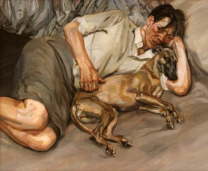 This painting encapsulates many of Freud’s signature elements: an intimate, almost intrusive portrayal of the sitter, the tension of the moment, and the palpable discomfort of the prolonged hours of posing. The sitter’s awkward pose, coupled with the dog’s restless energy, adds to the tension between the subjects. Freud’s penetrating gaze seems to strip away any artifice, capturing not just the physical appearance but also the underlying emotions of his subjects. This gaze is both fascinating and unsettling, a hallmark of Freud’s work that compels viewers to reflect on their own perception of vulnerability and exposure.
