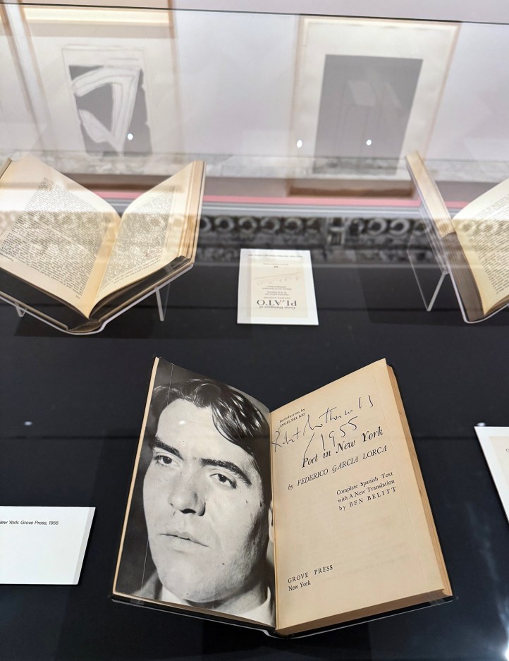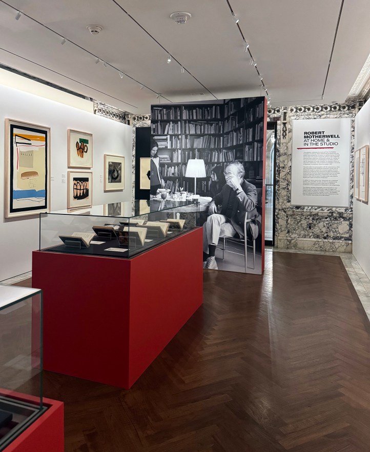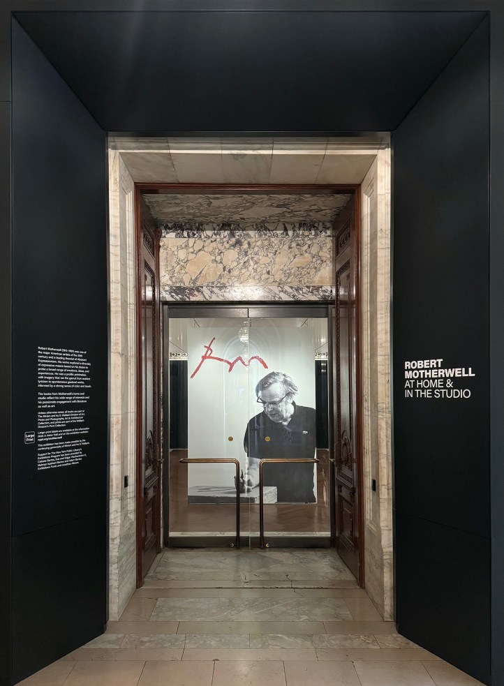 You enter the New York Public Library on Fifth Avenue—the lions, as always, pretending not to look at you—and without quite realizing it, you’ve stepped into a studio. The Wachenheim Gallery transforms into Robert Motherwell’s workspace, where books and pigments mix like gin and vermouth—though with decidedly more ink.