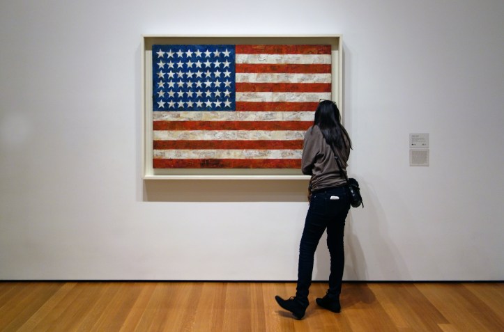 I don’t know about you, but sometimes on the Fourth of July I’d rather be in a cool museum than sweating on a picnic bench watching fireworks fizz like a cliché. And maybe that’s why I think of Flag, that cool, waxy miracle Jasper Johns dreamed up in 1954. Not just a flag, the flag—except it isn’t waving or screaming, it’s sitting there, quiet and stubborn, painted in encaustic like a wound that won’t quite scab over.