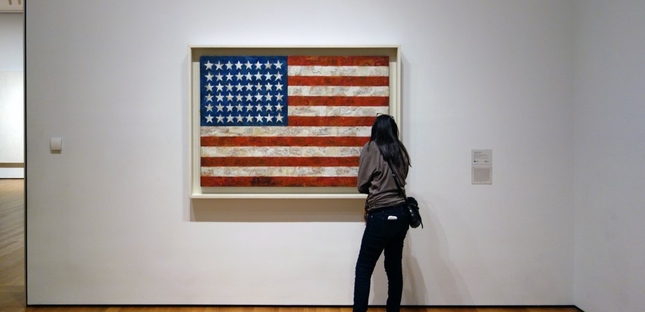 I don’t know about you, but sometimes on the Fourth of July I’d rather be in a cool museum than sweating on a picnic bench watching fireworks fizz like a cliché. And maybe that’s why I think of Flag, that cool, waxy miracle Jasper Johns dreamed up in 1954. Not just a flag, the flag—except it isn’t waving or screaming, it’s sitting there, quiet and stubborn, painted in encaustic like a wound that won’t quite scab over.
