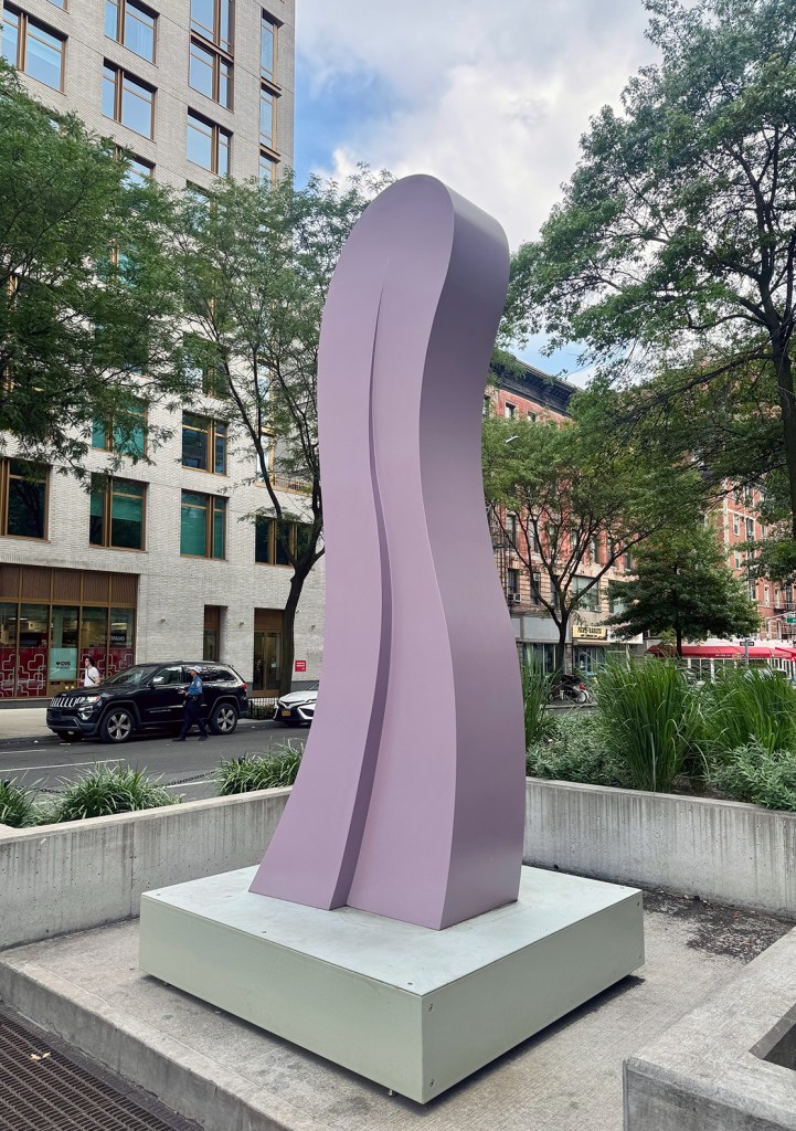 In Broadway Hubbub, presented by the Broadway Mall Association in collaboration with NYC Parks and HESSE FLATOW, D’Alvia places five towering sculptures from his Liths series into the heart of Manhattan’s kinetic artery. These are not passive monuments. They bend, slouch, lean, and loiter with us. They shimmer in gleaming auto paint—electric orange, bright pink, radiant blue—emitting a joy that feels both alien and oddly familiar. They seem to have walked out of a dream of Calder, gotten lost in a Tony Smith blueprint, and stumbled into the 21st century with new questions about form, presence, and humor.