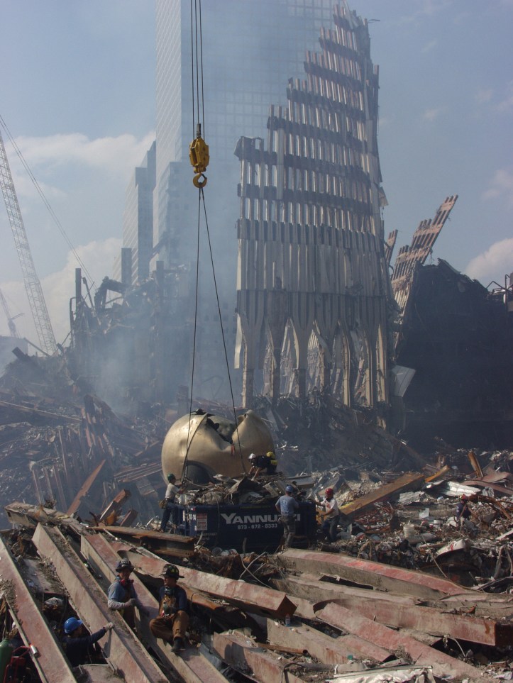 La Esfera (The Sphere, Fritz Koenig, bronce): resultó abollada por la caída de escombros, pero permaneció estructuralmente intacta. Fue desenterrada, restaurada en sus mecanismos internos y hoy se exhibe de nuevo como monumento memorial de la tragedia. Photo by Henry Ballate/Art-Sôlido