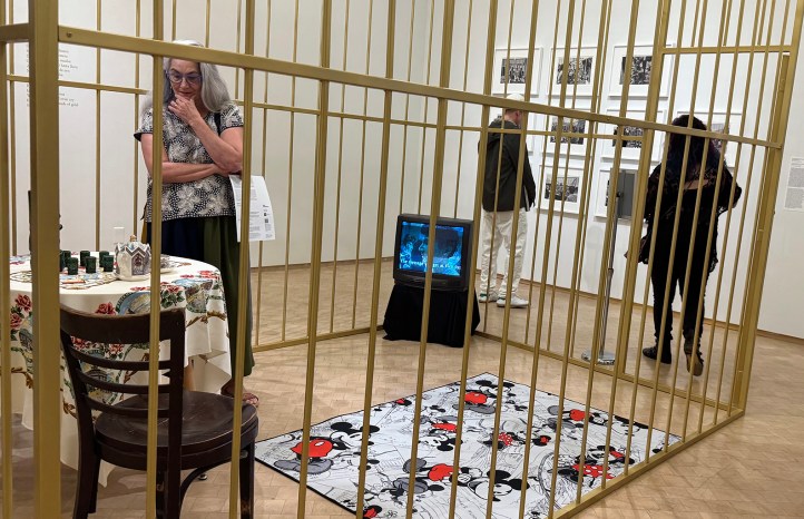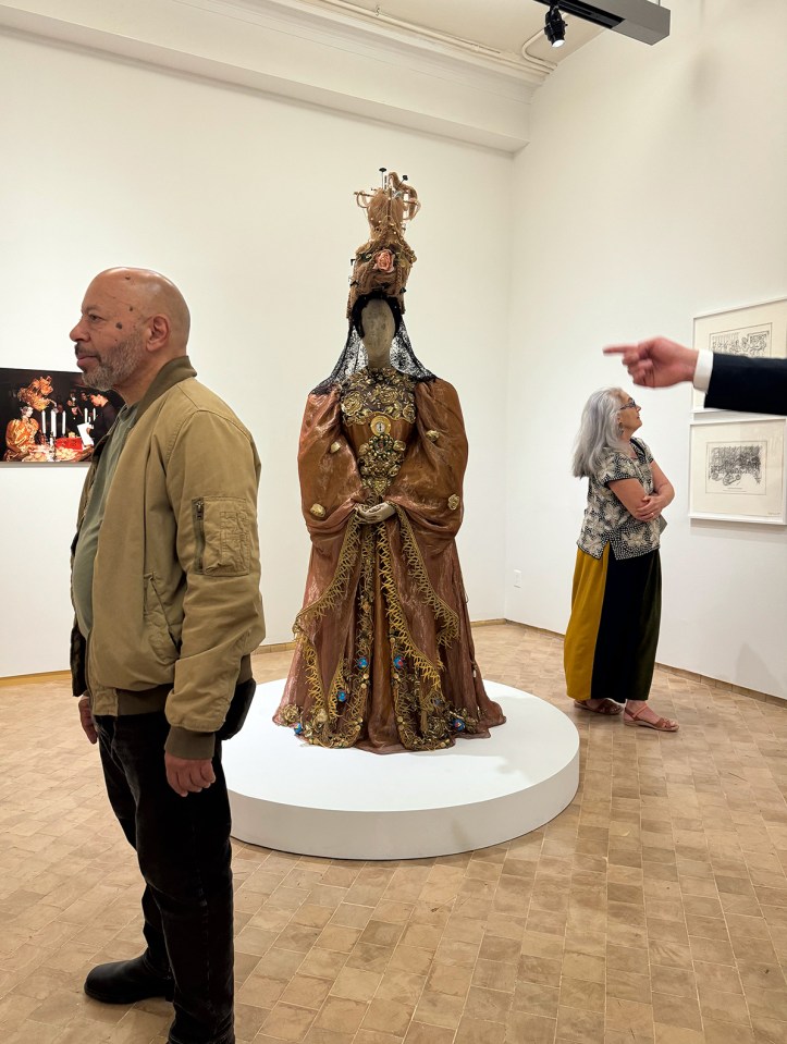 Moving further in, I stumble upon a golden cage installed in the gallery – an echo of Fusco’s Two Undiscovered Amerindians Visit the West (1992). In that infamous performance, Fusco and Guillermo Gómez-Peña donned pseudo-Indigenous costumes and sat inside a cage, as if “undiscovered” specimens on display. Visitors back then didn’t know whether to laugh or recoil; some even tried to feed the performers bananas. Here, the cage sits like a haunting remnant and a punchline at once. I catch myself half expecting ghosts of that satirical duo to appear, whispering witty retorts to the bemused onlookers in my imagination. The piece’s spirit lingers as a foundation of Fusco’s career – her blend of confrontation and dark humor established early on.